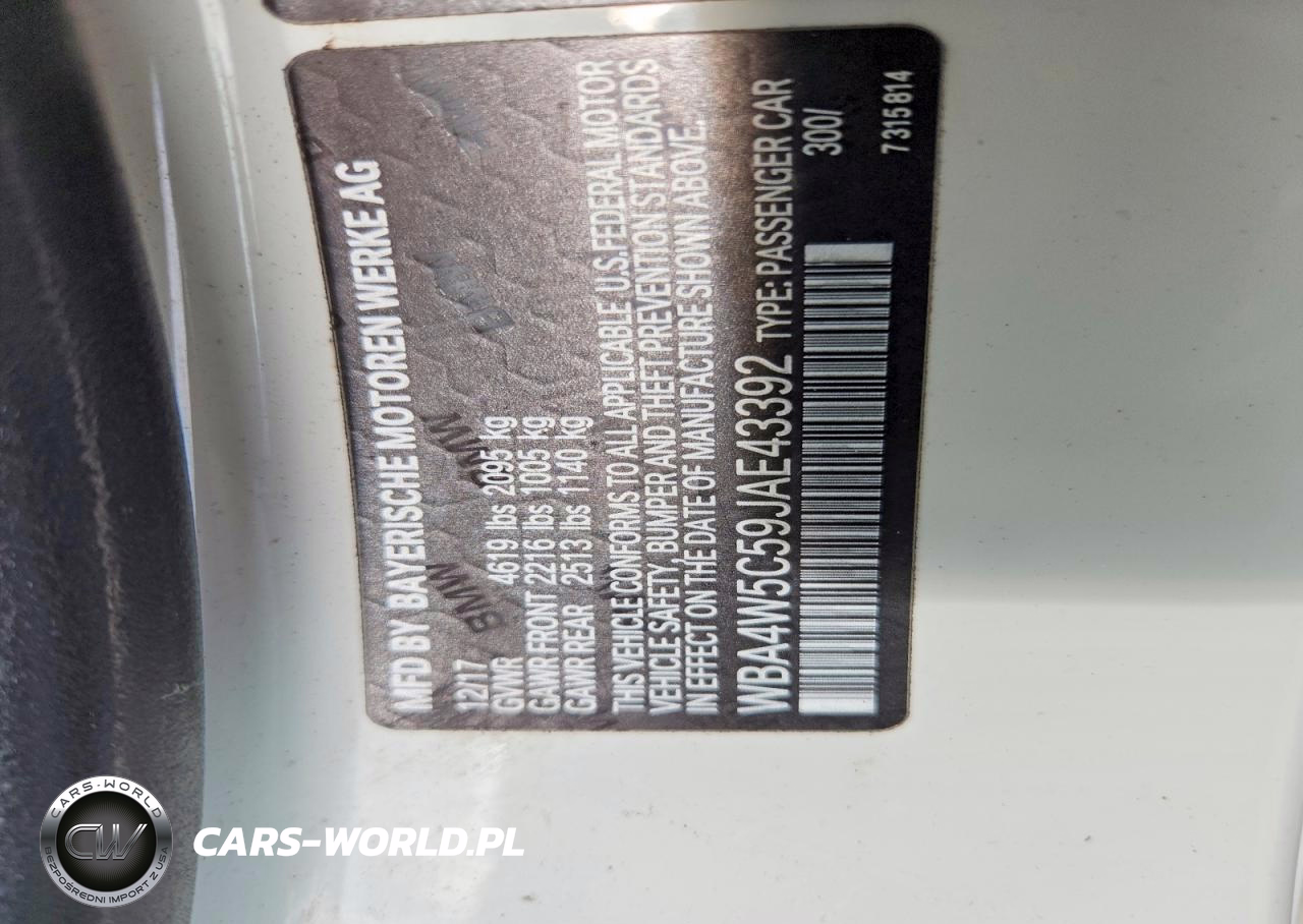 Copart Nr: C-50338306 VIN: WBA4W5C59JAE43392 Port: Elizabeth, NJ
