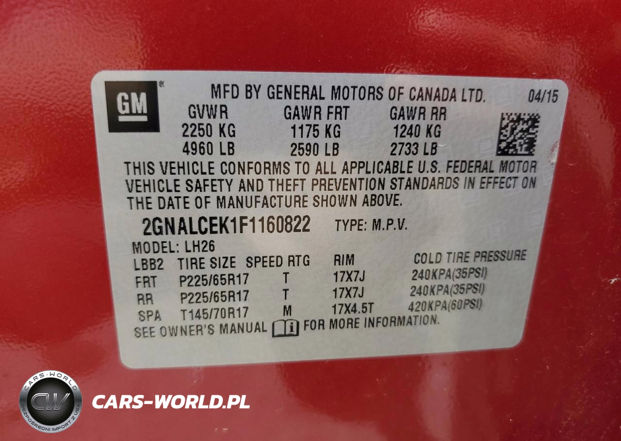 Copart Nr: C-64243295 VIN: 2GNALCEK1F1160822 Port: Indianapolis, IN