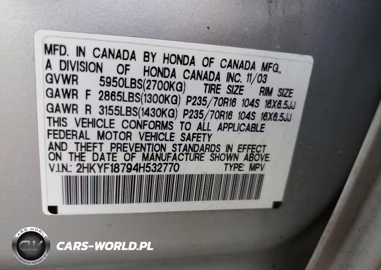 Copart Nr: C-69142175 VIN: 2HKYF18794H532770 Port: Elizabeth, NJ