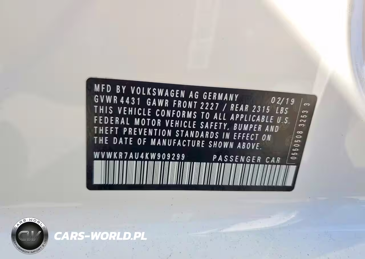 Copart Nr: C-73018315 VIN: WVWKR7AU4KW909299 Port: Los Angeles, CA