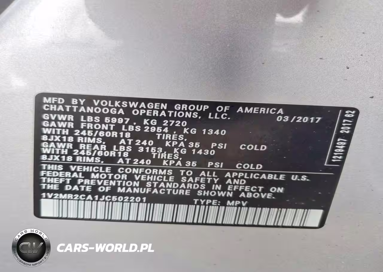 Copart Nr: C-73075905 VIN: 1V2MR2CA1JC502201 Port: Elizabeth, NJ