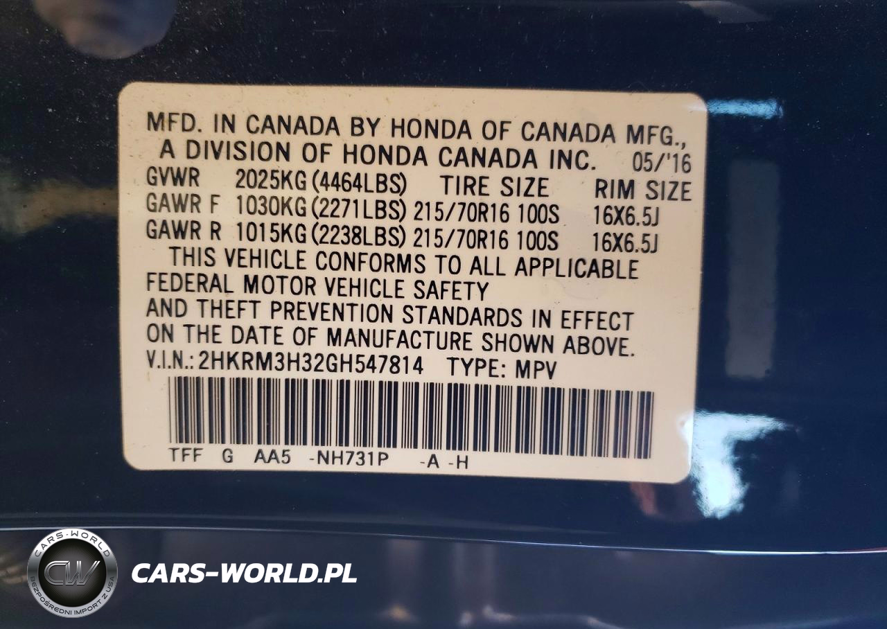 Copart Nr: C-73637035 VIN: 2HKRM3H32GH547814 Port: Elizabeth, NJ