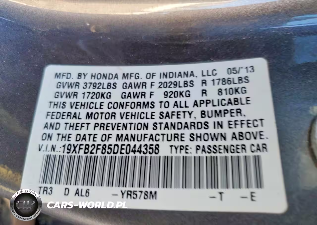 Copart Nr: C-74858705 VIN: 19XFB2F85DE044358 Port: Los Angeles, CA