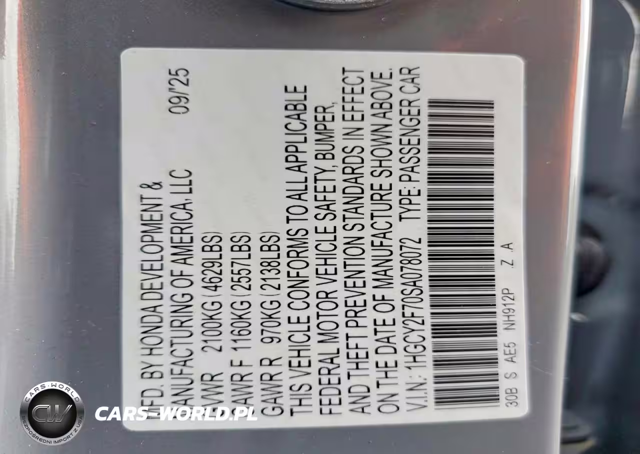 Copart Nr: C-75213145 VIN: 1HGCY2F70SA078072 Port: Los Angeles, CA
