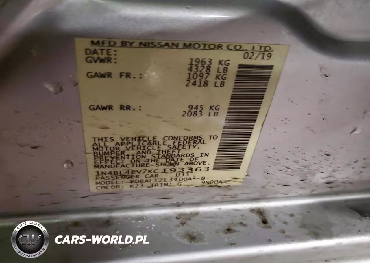 Copart Nr: C-75551425 VIN: 1N4BL4EV7KC193363 Port: Indianapolis, IN