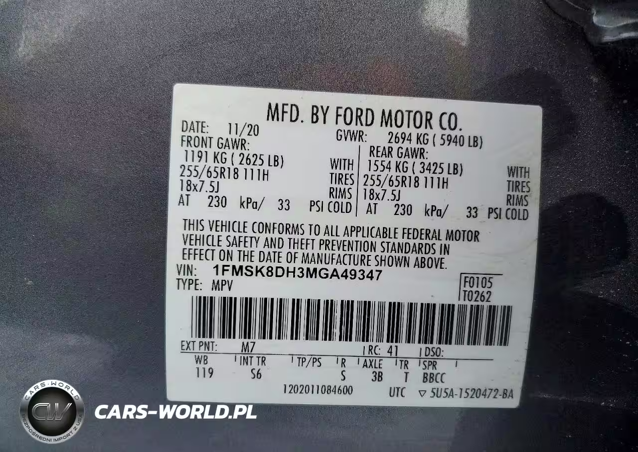 Copart Nr: C-75821565 VIN: 1FMSK8DH3MGA49347 Port: Indianapolis, IN