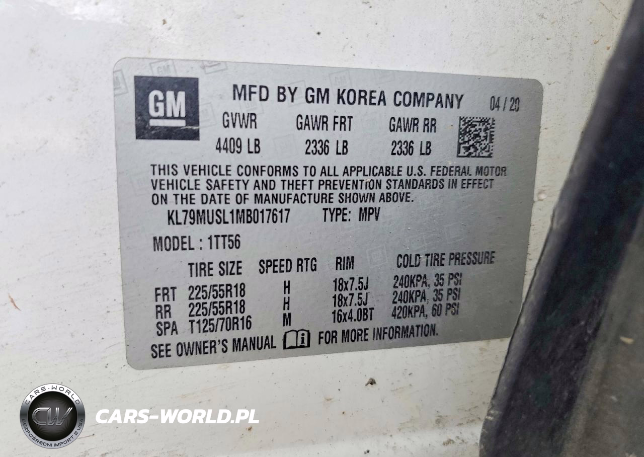 Copart Nr: C-76628945 VIN: KL79MUSL1MB017617 Port: Elizabeth, NJ