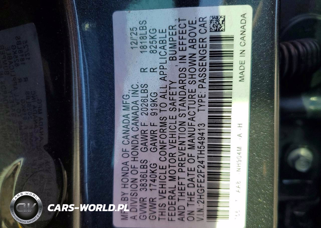 Copart Nr: C-77126375 VIN: 2HGFE2F24TH549413 Port: Savannah, GA