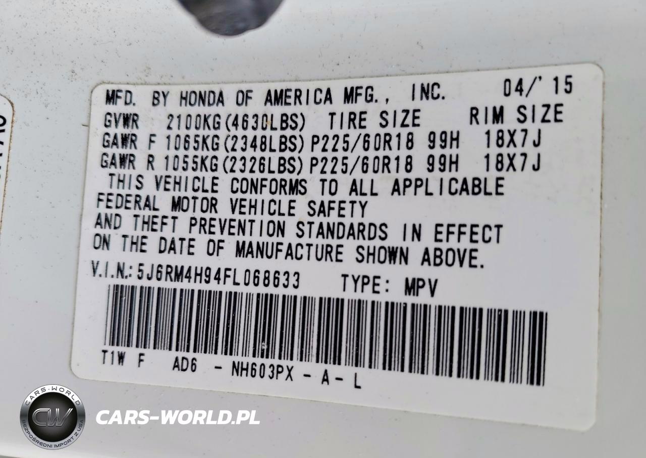 Copart Nr: C-77289215 VIN: 5J6RM4H94FL068633 Port: Elizabeth, NJ
