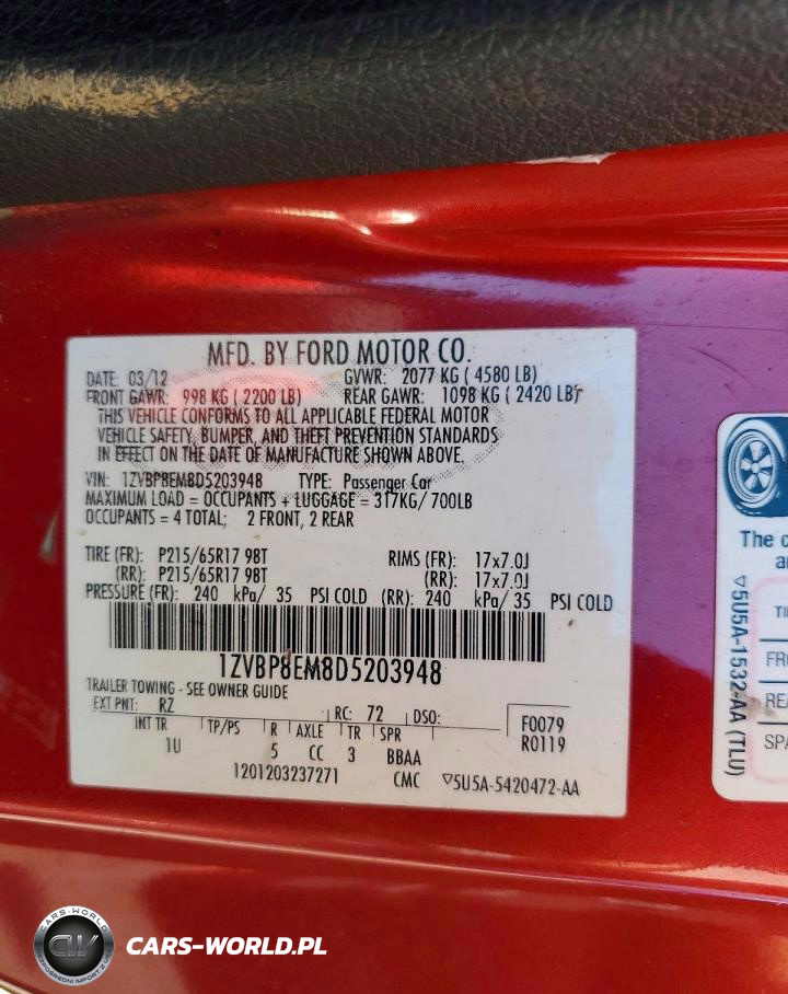 Copart Nr: C-77602245 VIN: 1ZVBP8EM8D5203948 Port: Los Angeles, CA