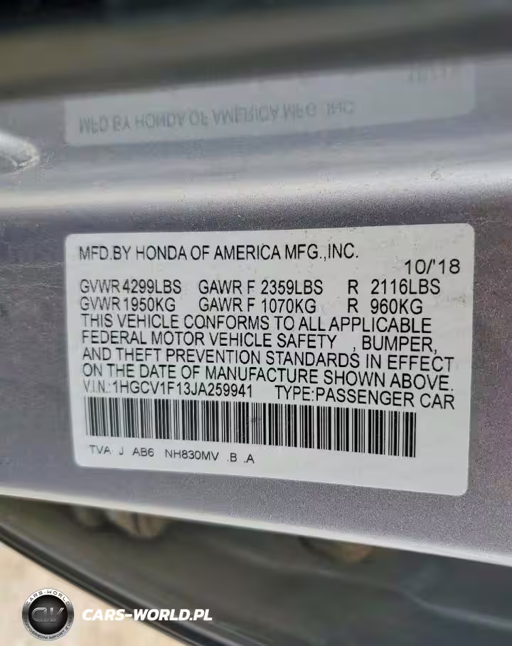 Copart Nr: C-78136455 VIN: 1HGCV1F13JA259941 Port: Savannah, GA