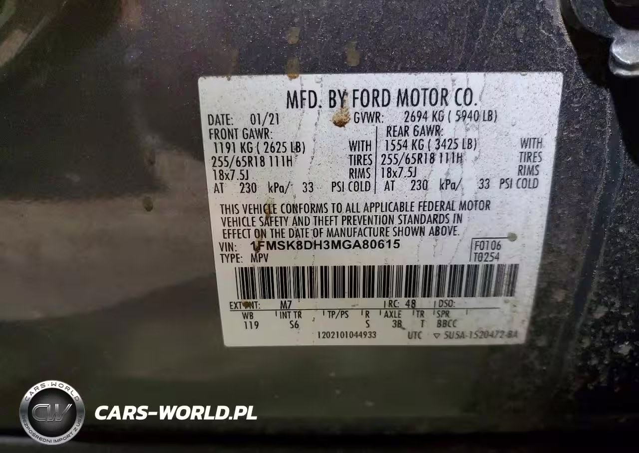Copart Nr: C-78151845 VIN: 1FMSK8DH3MGA80615 Port: Indianapolis, IN