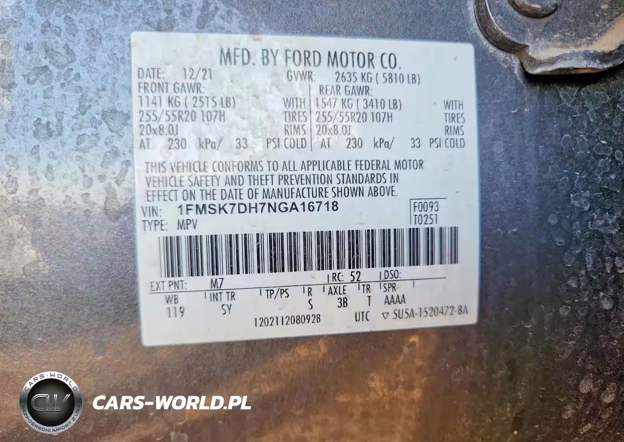 Copart Nr: C-78317235 VIN: 1FMSK7DH7NGA16718 Port: Houston, TX