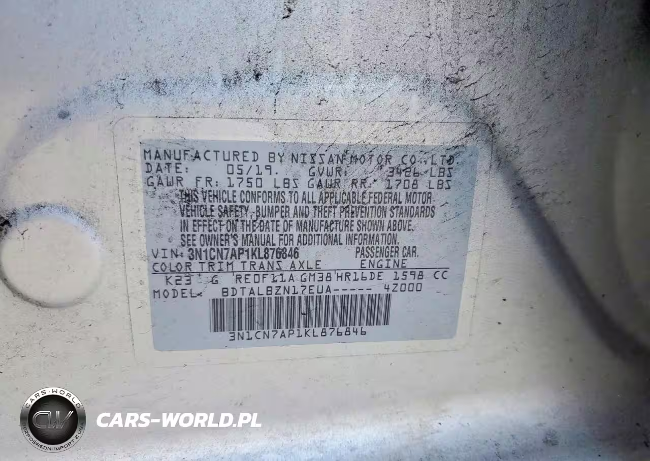 Copart Nr: C-78326135 VIN: 3N1CN7AP1KL876846 Port: Savannah, GA