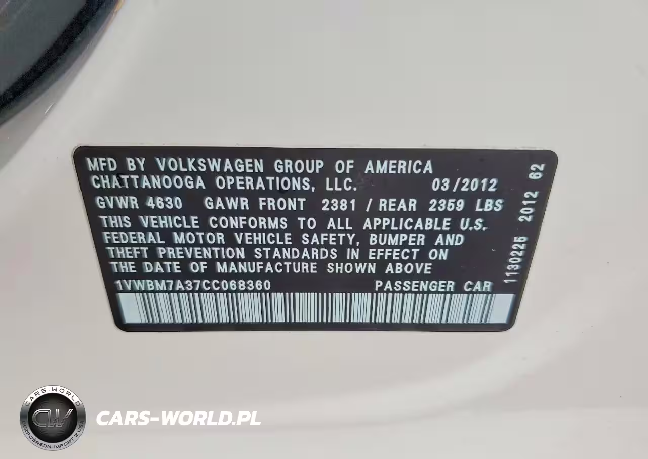 Copart Nr: C-78344945 VIN: 1VWBM7A37CC068360 Port: Elizabeth, NJ