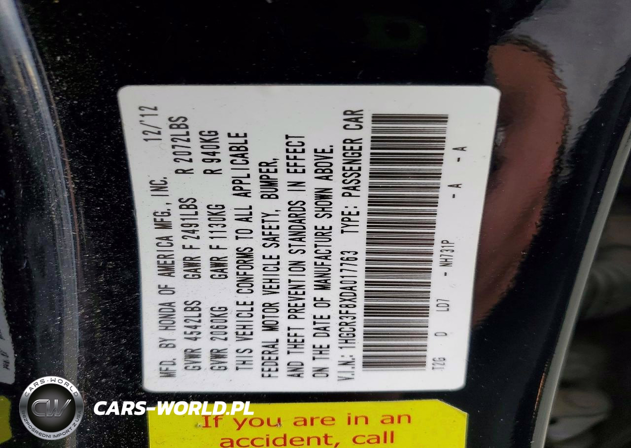 Copart Nr: C-78376175 VIN: 1HGCR3F8XDA017763 Port: Los Angeles, CA