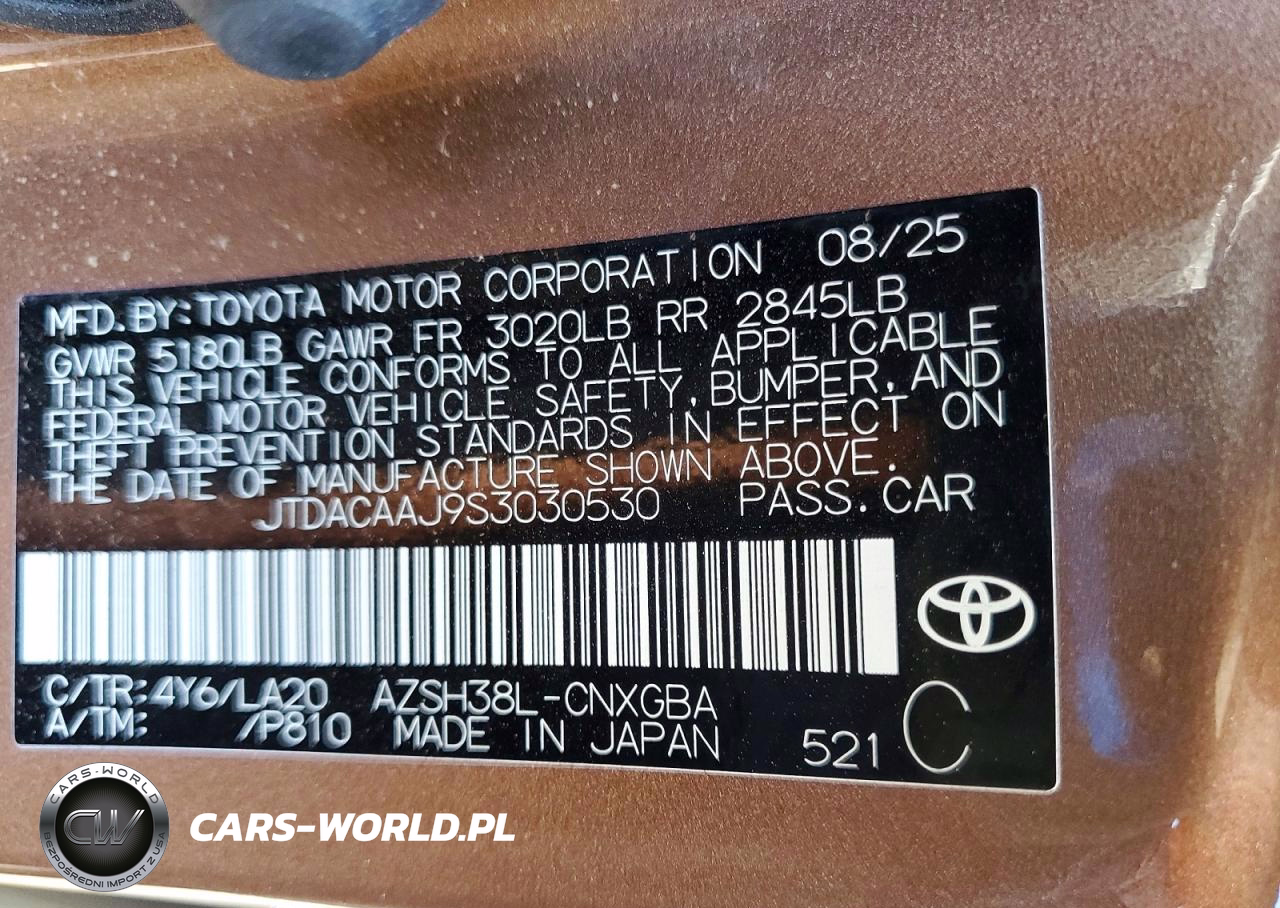 Copart Nr: C-78681595 VIN: JTDACAAJ9S3030530 Port: Los Angeles, CA