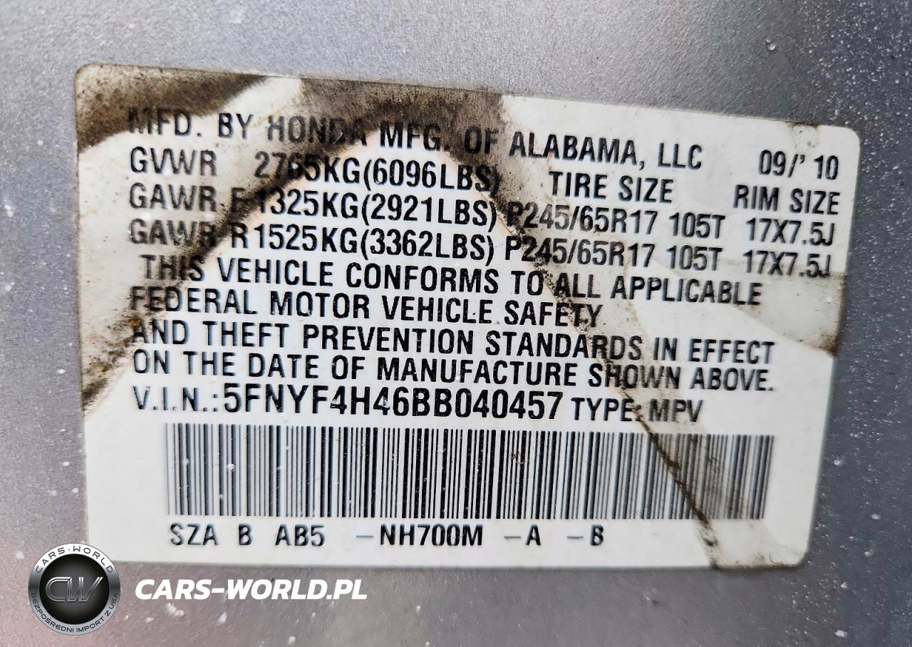 Copart Nr: C-78803165 VIN: 5FNYF4H46BB040457 Port: Elizabeth, NJ