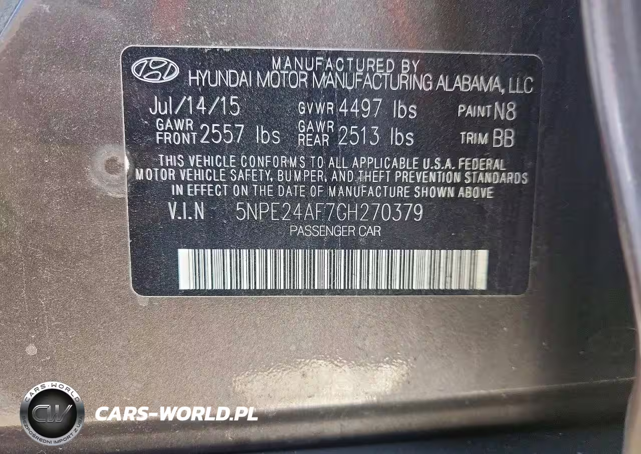 Copart Nr: C-78905625 VIN: 5NPE24AF7GH270379 Port: Elizabeth, NJ