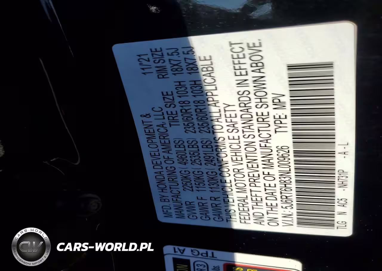 Copart Nr: C-79087785 VIN: 5J6RT6H83NL009626 Port: Elizabeth, NJ