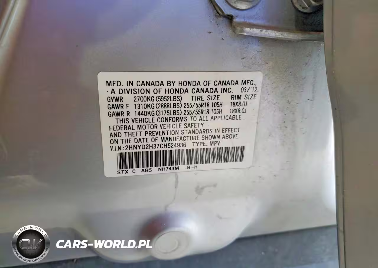 Copart Nr: C-79224525 VIN: 2HNYD2H37CH524936 Port: Indianapolis, IN