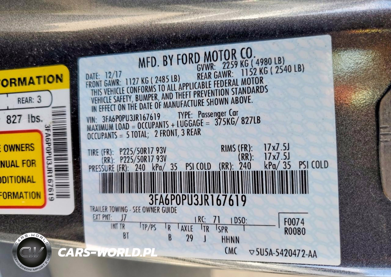 Copart Nr: C-79573795 VIN: 3FA6P0PU3JR167619 Port: Los Angeles, CA