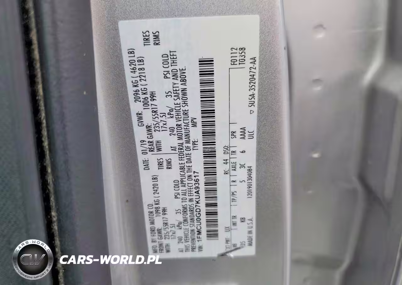 Copart Nr: C-79611395 VIN: 1FMCU0GD7KUA93617 Port: Savannah, GA