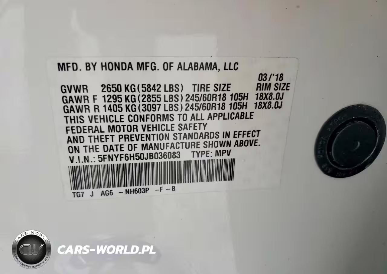 Copart Nr: C-79668435 VIN: 5FNYF6H50JB036083 Port: Savannah, GA