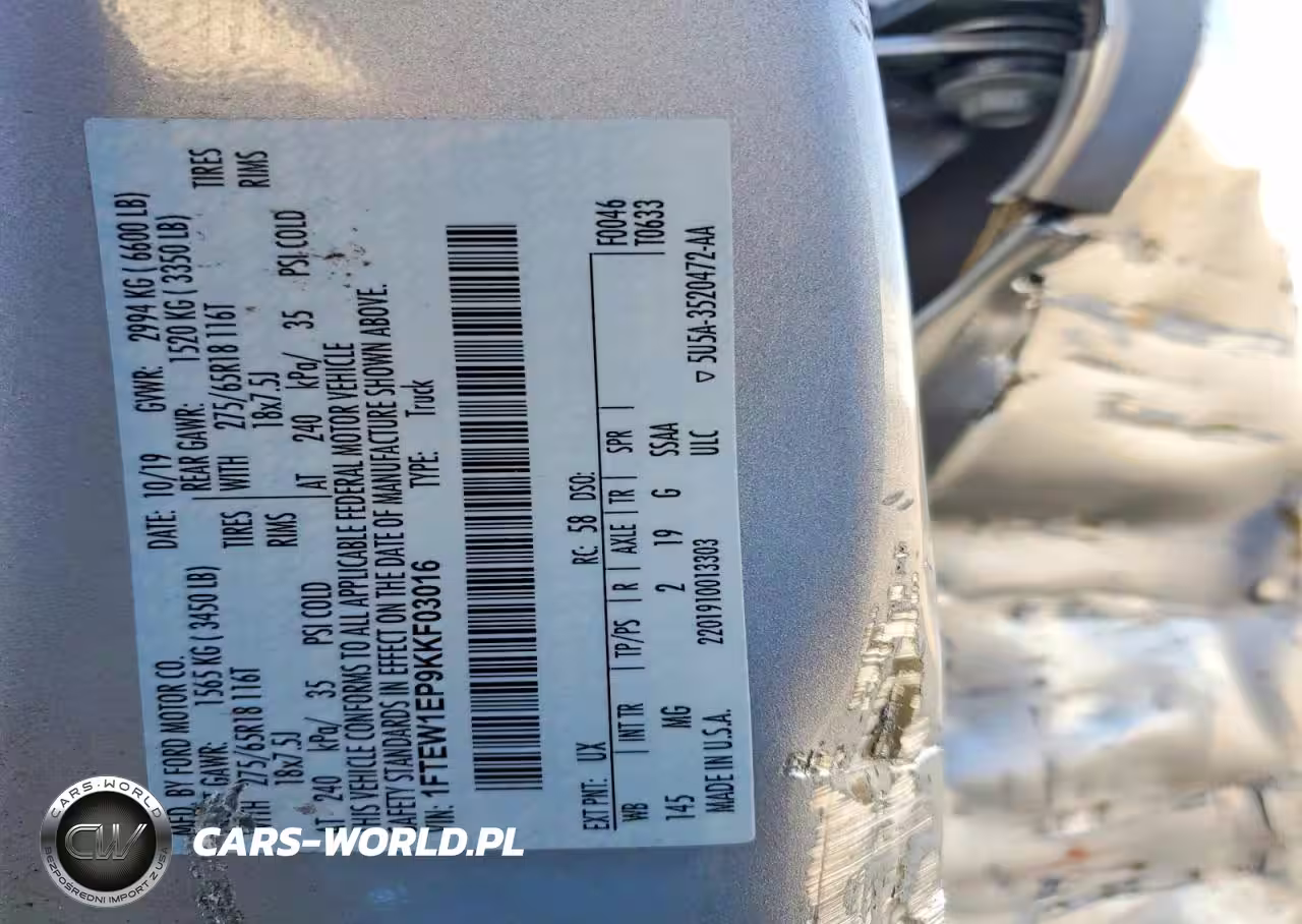 Copart Nr: C-79987855 VIN: 1FTEW1EP9KKF03016 Port: Indianapolis, IN