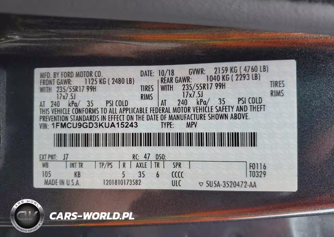 Copart Nr: C-79997425 VIN: 1FMCU9GD3KUA15243 Port: Indianapolis, IN