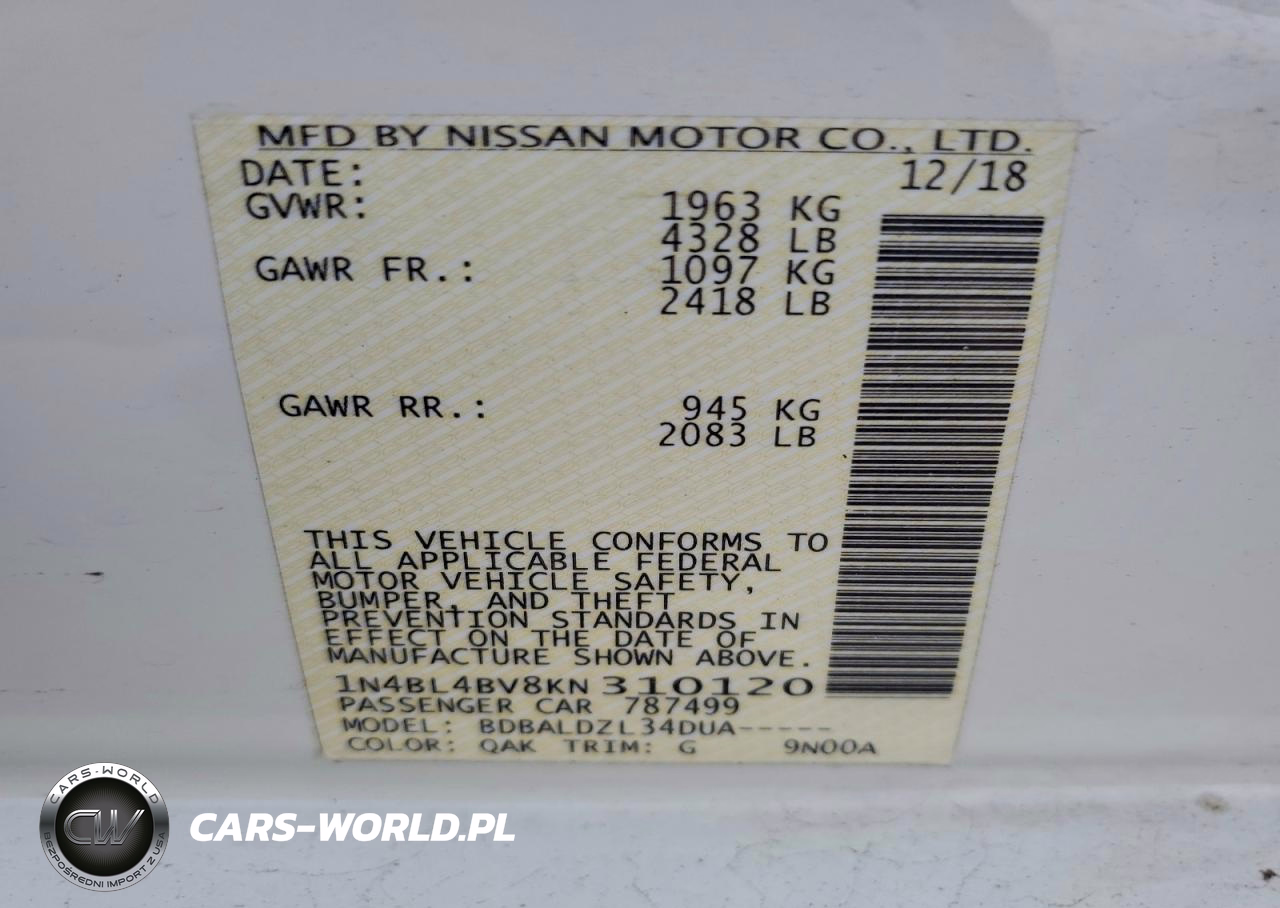 Copart Nr: C-94334755 VIN: 1N4BL4BV8KN310120 Port: Elizabeth, NJ