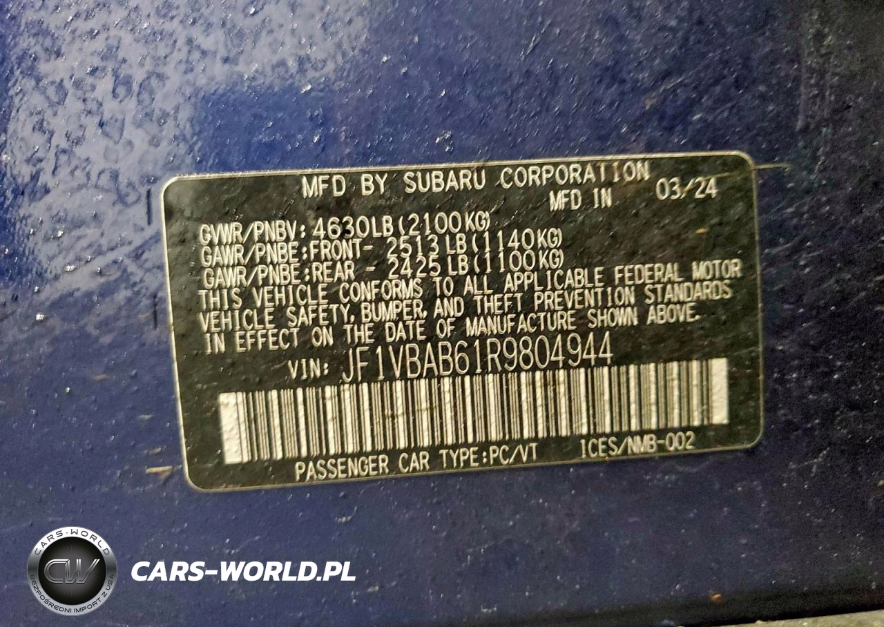 Copart Nr: C-95213725 VIN: JF1VBAB61R9804944 Port: Elizabeth, NJ