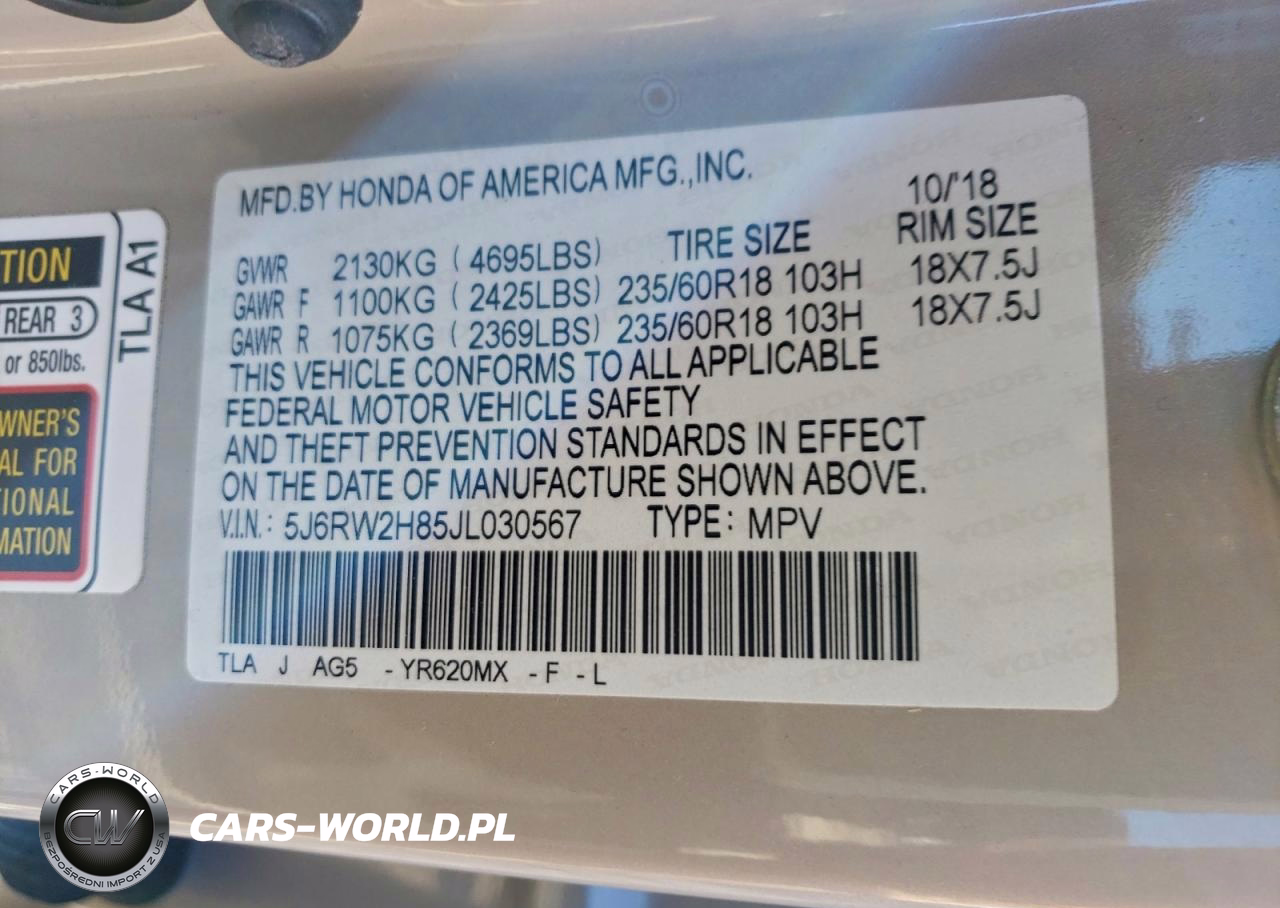 Copart Nr: C-98361355 VIN: 5J6RW2H85JL030567 Port: Elizabeth, NJ