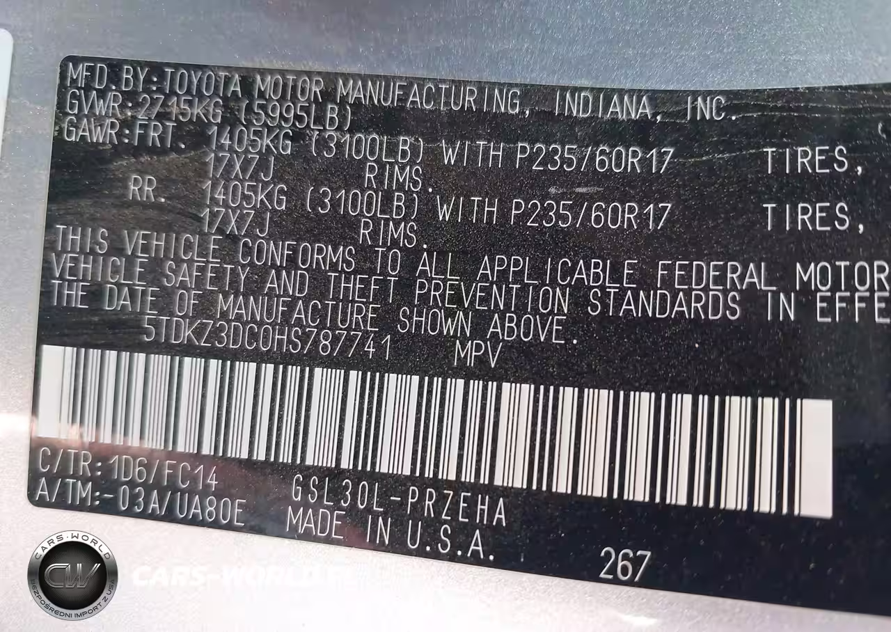 IAAI Nr: I-40058606 VIN: 5TDKZ3DC0HS787741 Port: Los Angeles, CA