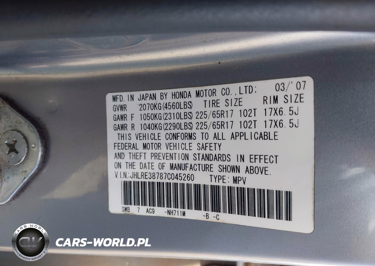 IAAI Nr: I-41381328 VIN: JHLRE38787C045260 Port: Los Angeles, CA