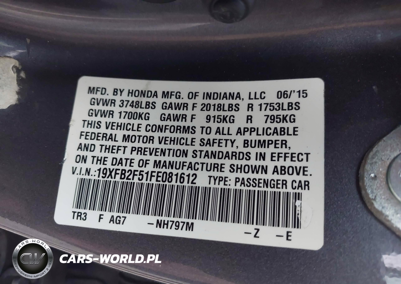 IAAI Nr: I-43230509 VIN: 19XFB2F51FE081612 Port: Indianapolis, IN