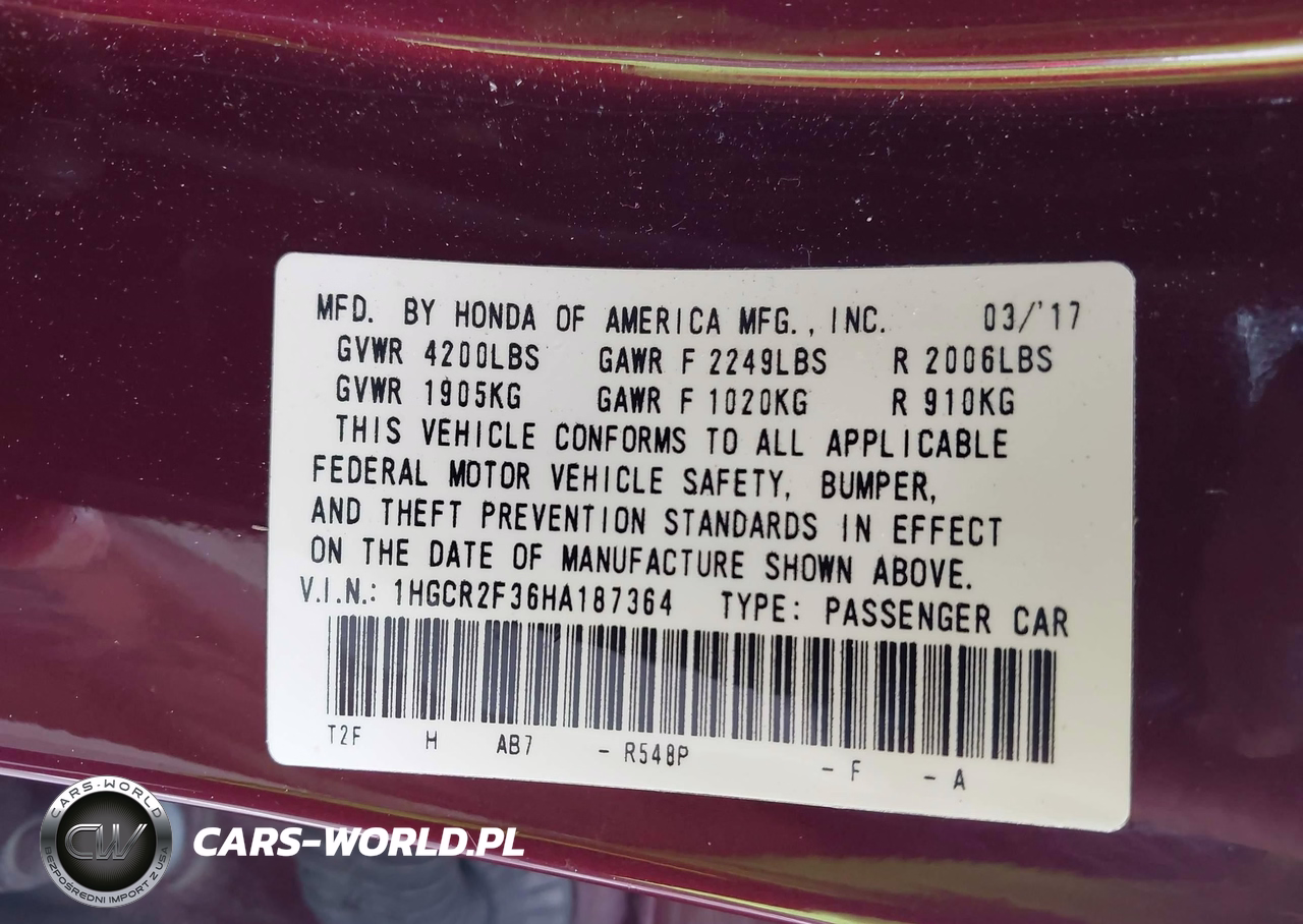 IAAI Nr: I-43329223 VIN: 1HGCR2F36HA187364 Port: Savannah, GA