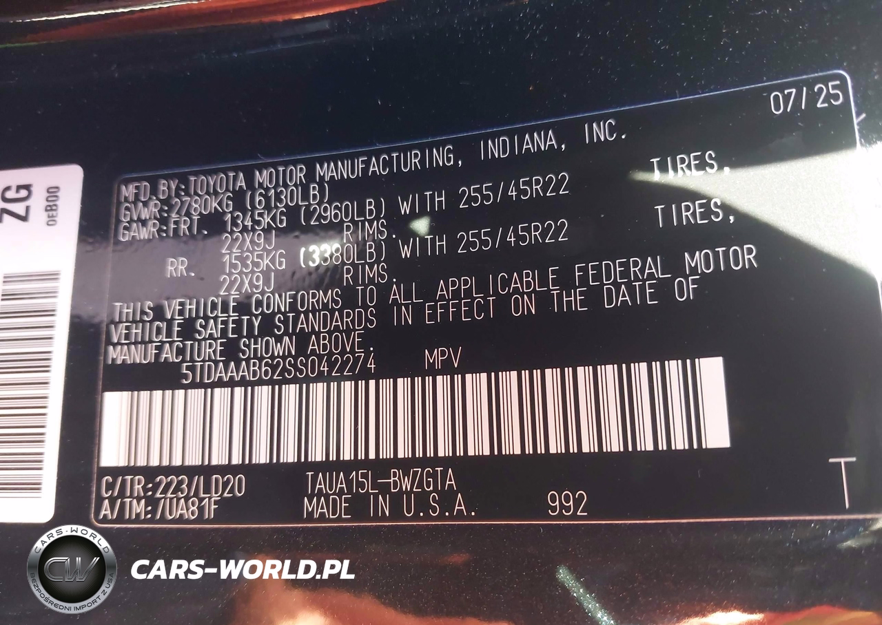 IAAI Nr: I-43353587 VIN: 5TDAAAB62SS042274 Port: Indianapolis, IN