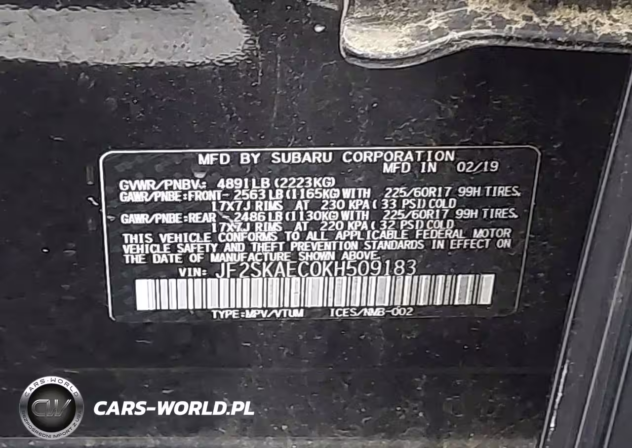 IAAI Nr: I-43533856 VIN: JF2SKAEC0KH509183 Port: Savannah, GA