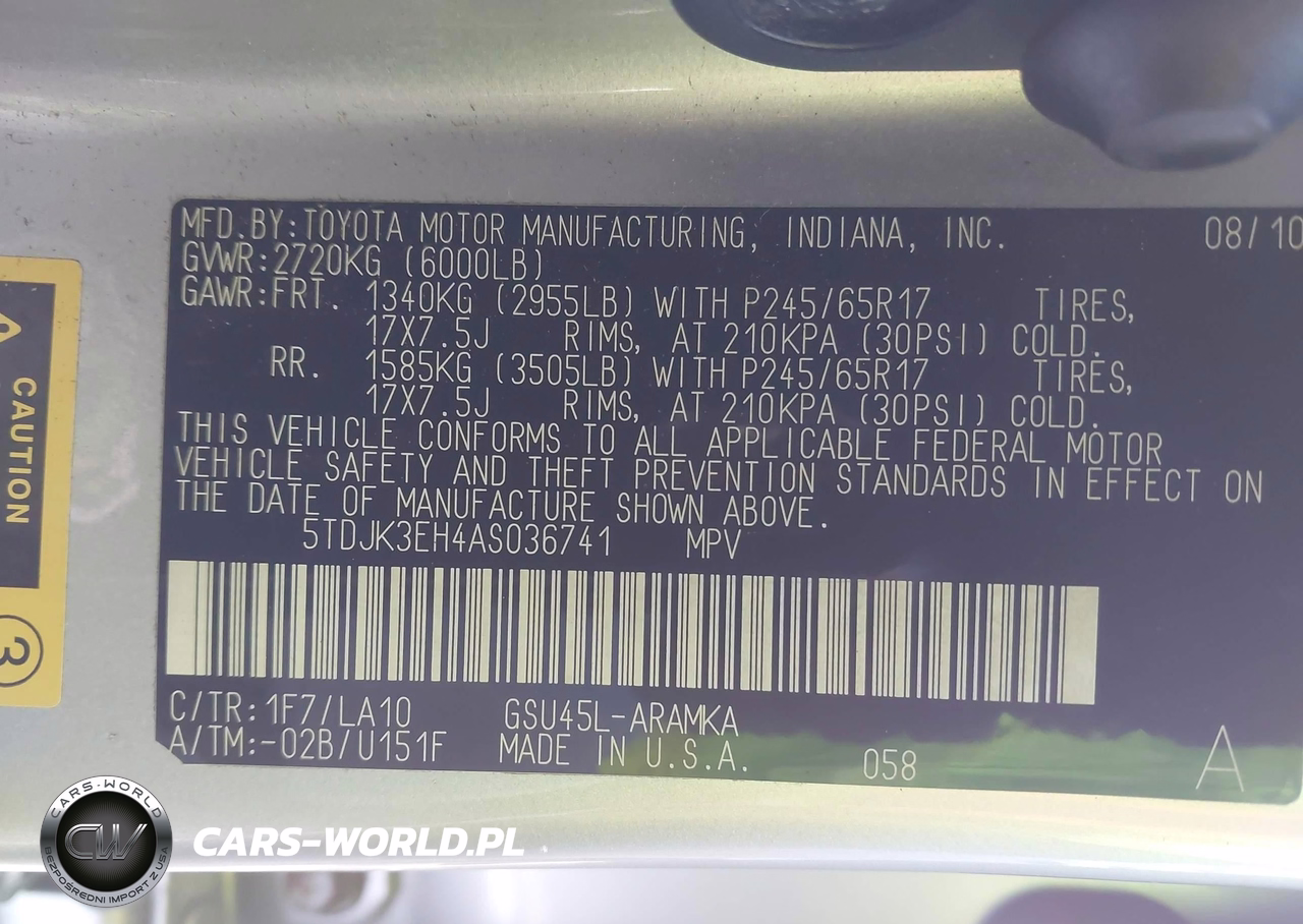 IAAI Nr: I-43902265 VIN: 5TDJK3EH4AS036741 Port: Elizabeth, NJ