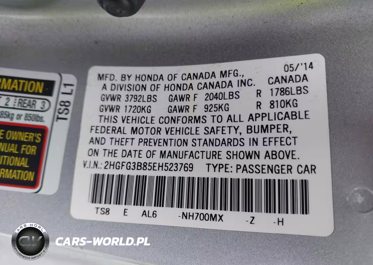 IAAI Nr: I-43939347 VIN: 2HGFG3B85EH523769 Port: Indianapolis, IN
