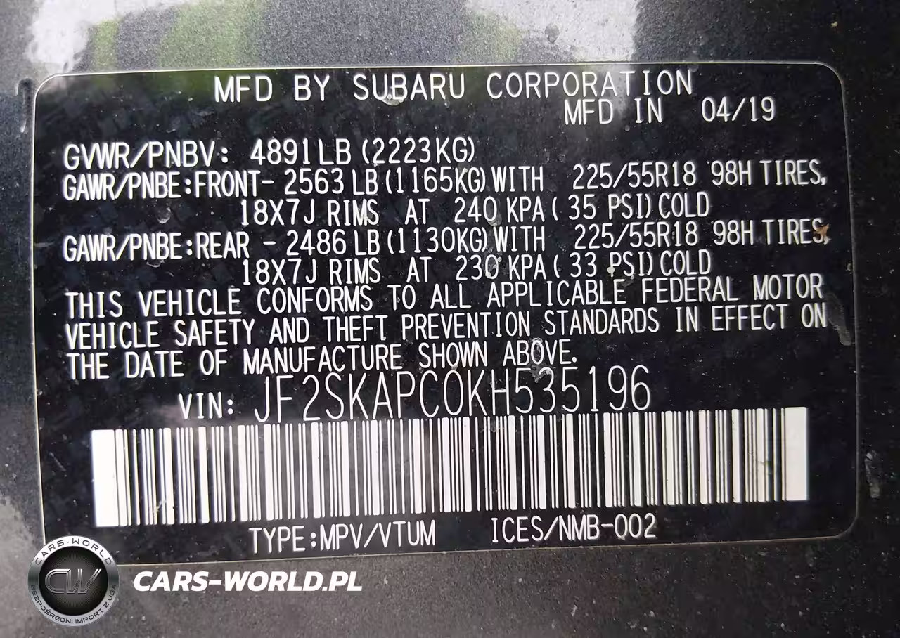 IAAI Nr: I-43955234 VIN: JF2SKAPC0KH535196 Port: Indianapolis, IN