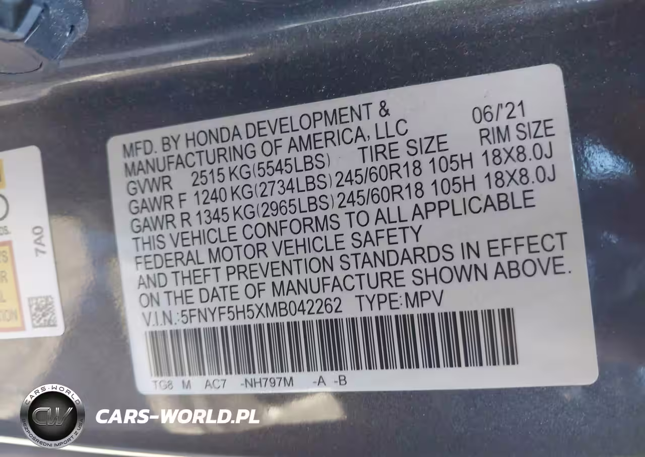 IAAI Nr: I-44015146 VIN: 5FNYF5H5XMB042262 Port: Elizabeth, NJ