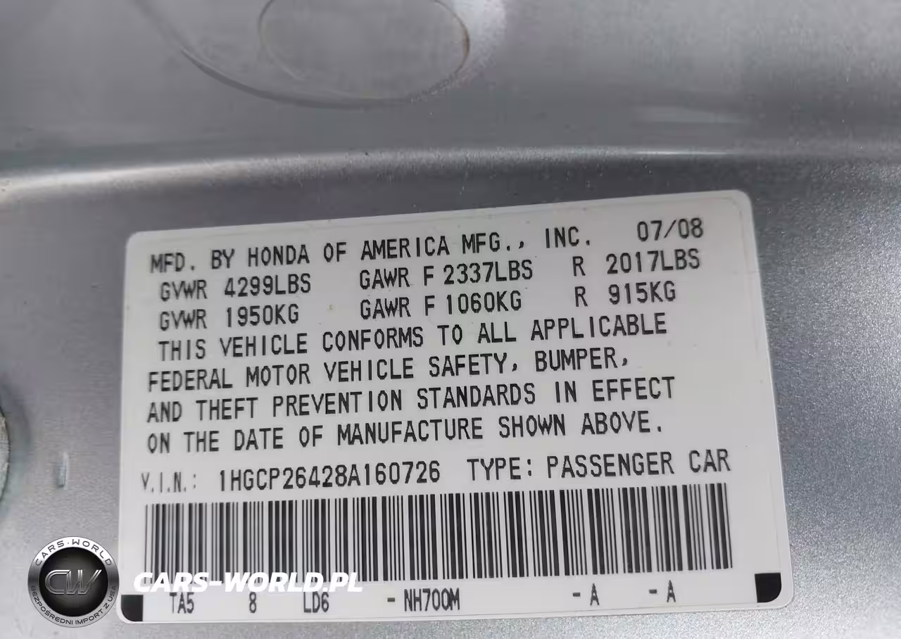 IAAI Nr: I-44030087 VIN: 1HGCP26428A160726 Port: Houston, TX