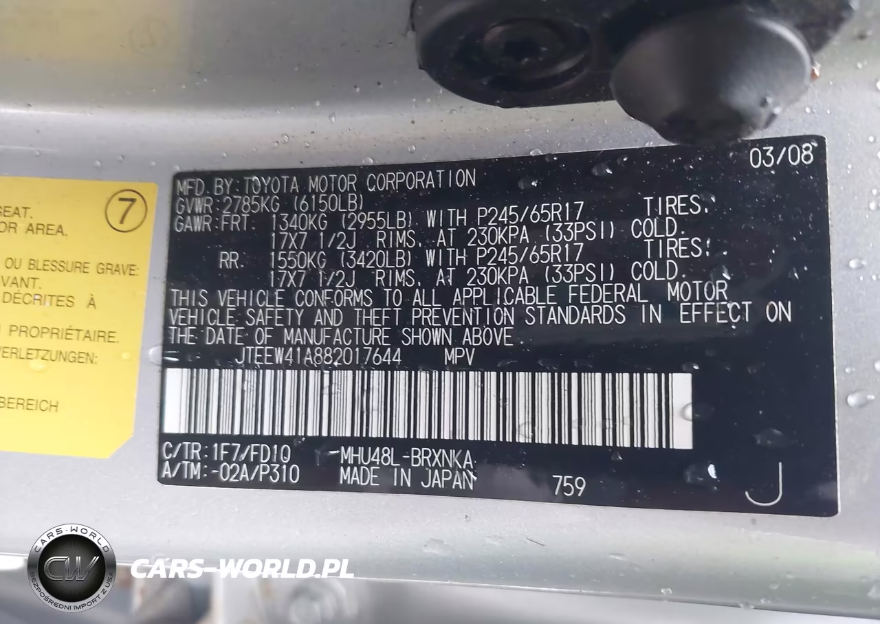 IAAI Nr: I-44048276 VIN: JTEEW41A882017644 Port: Elizabeth, NJ