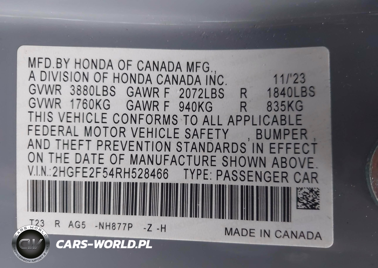 IAAI Nr: I-44048637 VIN: 2HGFE2F54RH528466 Port: Elizabeth, NJ