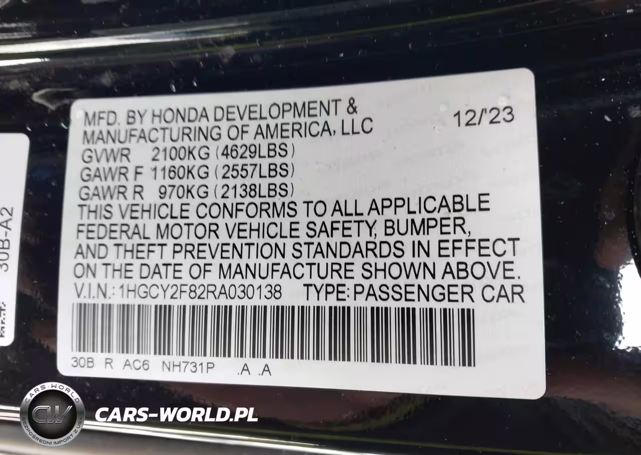 IAAI Nr: I-44149111 VIN: 1HGCY2F82RA030138 Port: Elizabeth, NJ