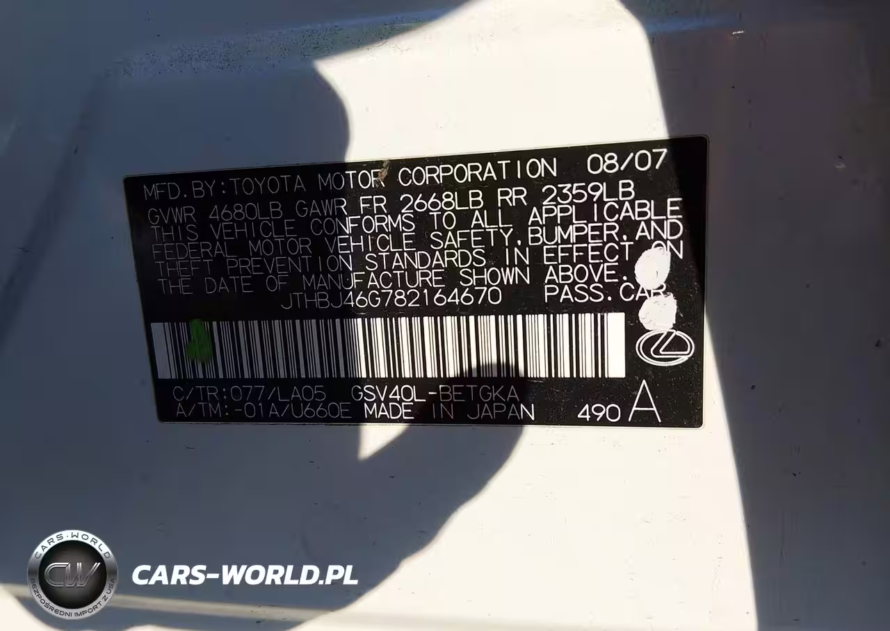 IAAI Nr: I-44204212 VIN: JTHBJ46G782164670 Port: Savannah, GA