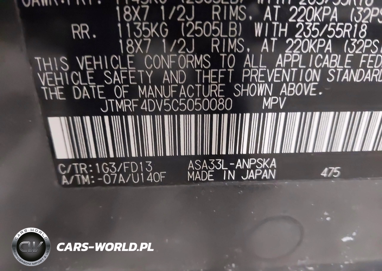 IAAI Nr: I-44217254 VIN: JTMRF4DV5C5050080 Port: Indianapolis, IN