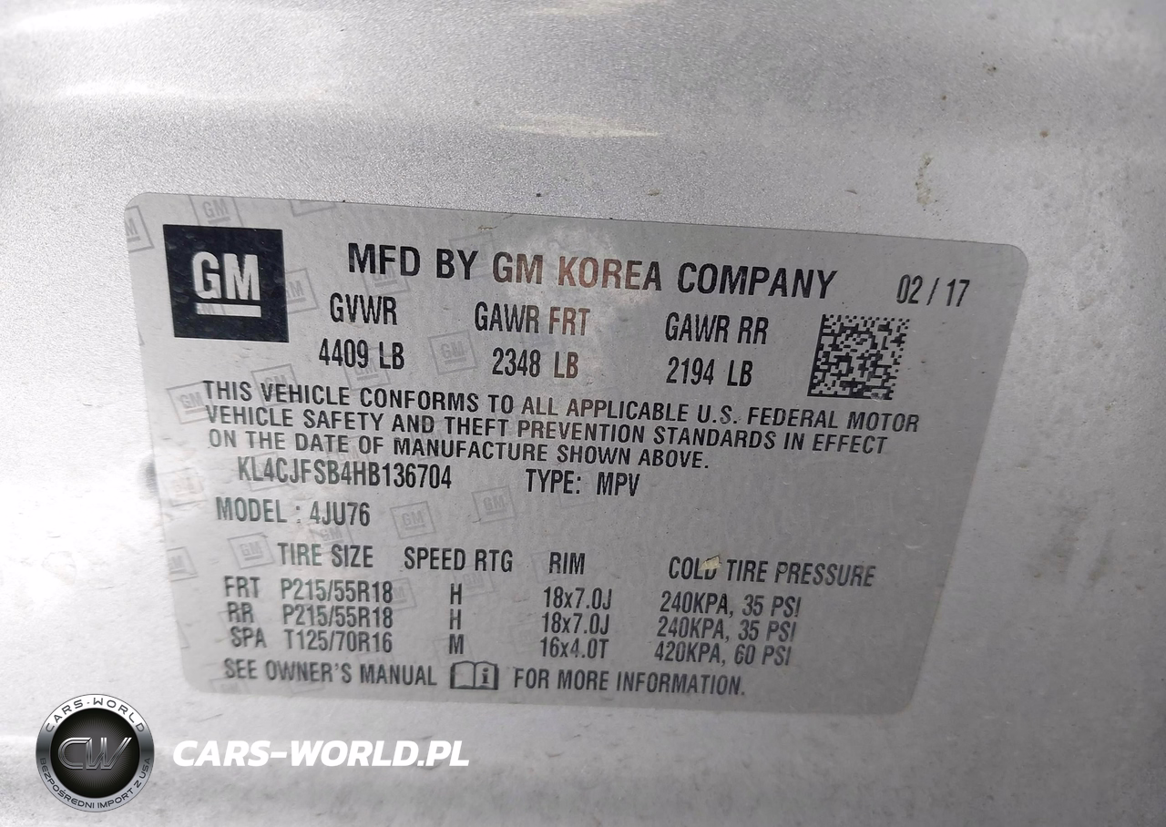 IAAI Nr: I-44252591 VIN: KL4CJFSB4HB136704 Port: Houston, TX